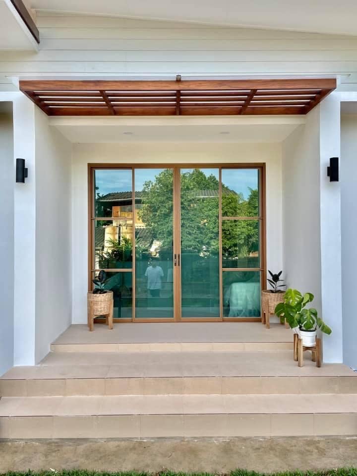 ประตูทางเข้าบ้านเป็นประตูแบบกระจกใส ตกแต่งกรอบในโทนสีน้ำตาล เช่นเดียวกับหลังคากันสาดด้านบนที่ถูกตกแต่งด้วยโครงไม้สีน้ำตาล