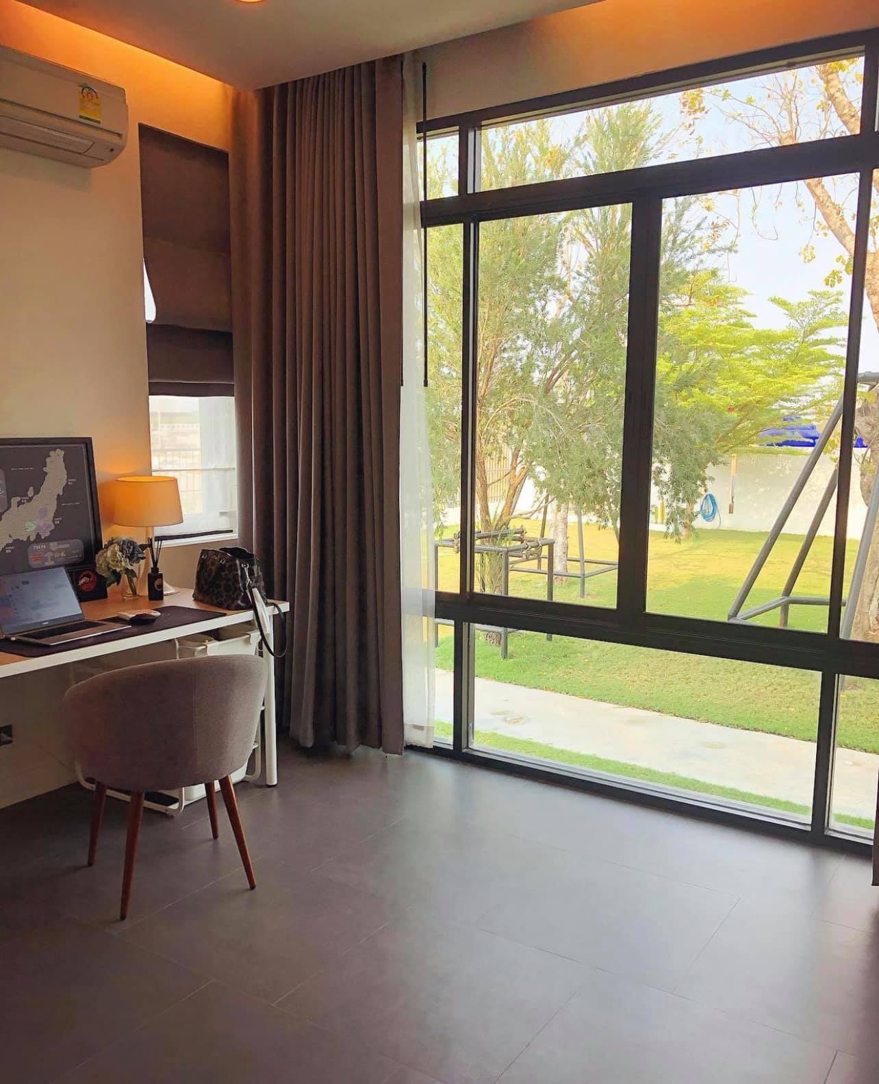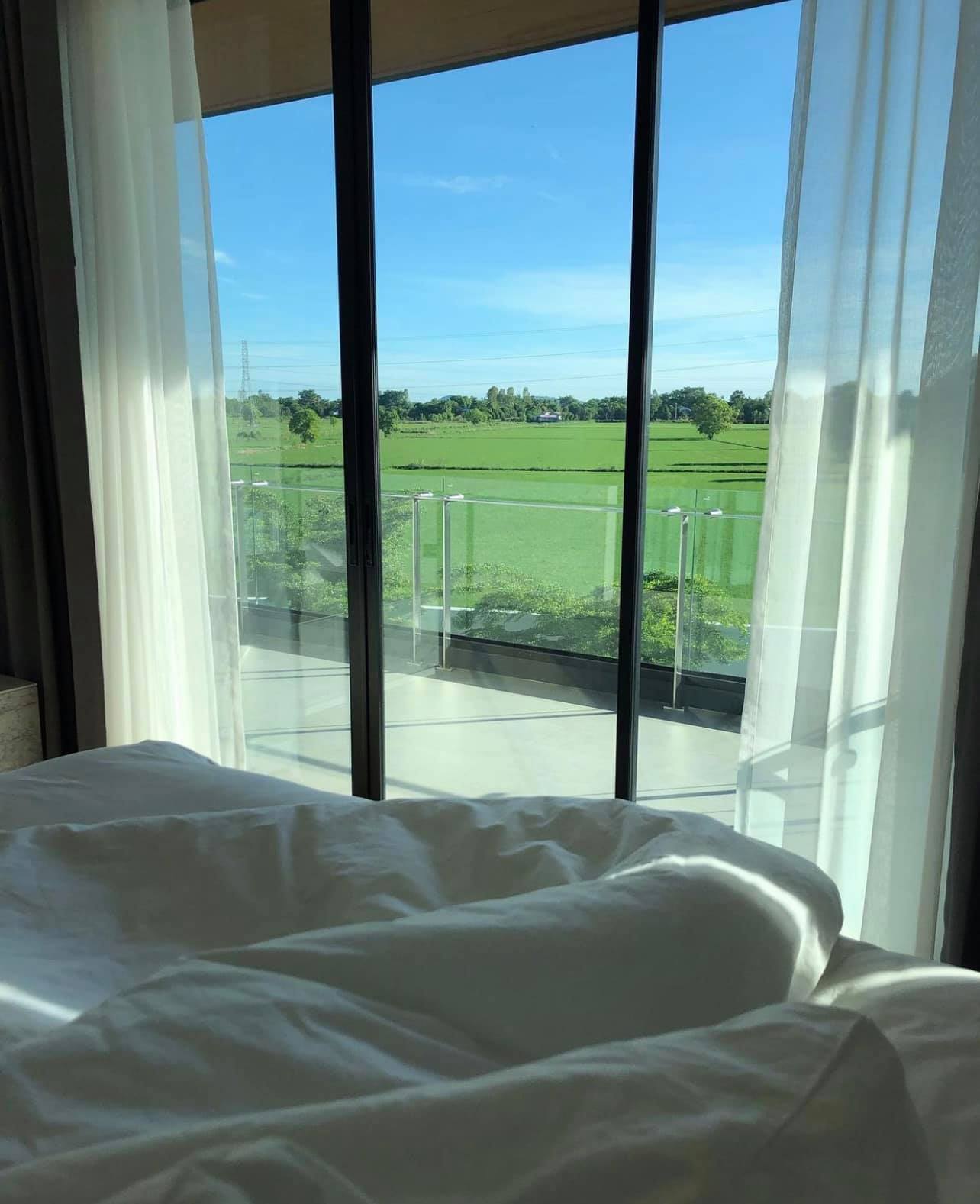บริเวณของห้องนอนออกแบบให้มีมุมหน้าต่างที่มองเห็นวิวทุ่งนาสีเขียวด้านนอก ทำให้เป็นห้องที่เหมาะกับการพักผ่อนได้อย่างเต็มที่
