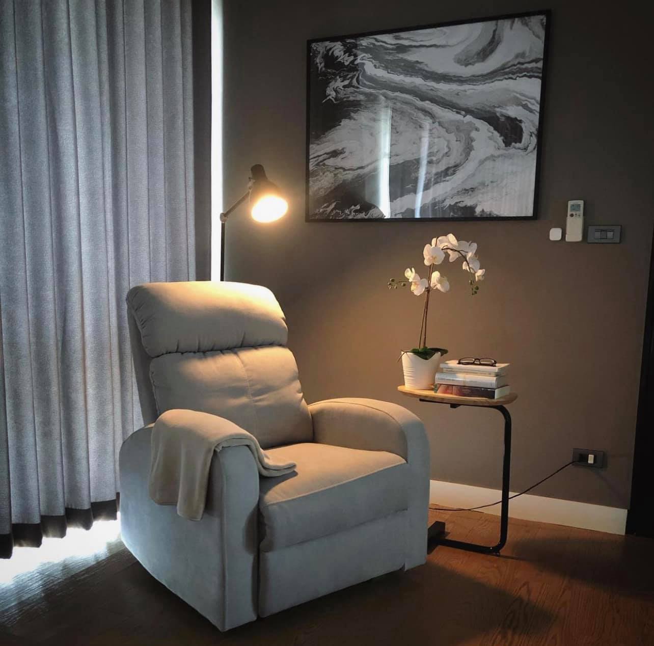 ภายในบ้านก็จะยังคงเน้นการตกแต่งในโทนสีที่เจ้าของบ้านชอบ เฟอร์นิเจอร์ภายในบ้านก็จะมีความเรียบ ๆ อย่างเช่นมุมนี้ที่เป็นมุมสำหรับการพักผ่อนโดยเฉพาะ