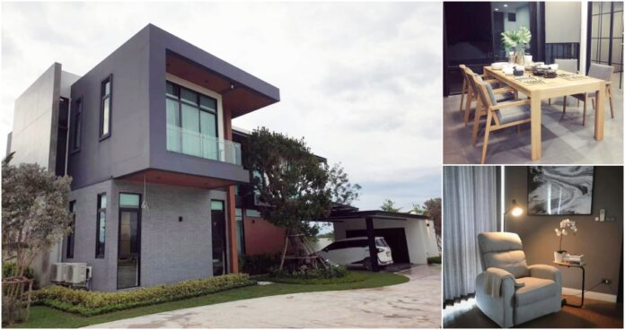ตัวบ้านเป็นบ้านขนาดสองชั้น พื้นฐานการออกแบบของบ้านหลังนี้จะมีดีไซน์แบบโมเดิร์น ทำให้ตัวบ้านมีลักษณะทรงสี่เหลี่ยมแบบเรขาคณิตอย่างเด่นชัด แน่นอนว่าการตกแต่งภายนอกก็จะเน้นโทนสีขาว เทา น้ำตาล และดำ ตามที่เจ้าของบ้านชื่นชอบนั่นเอง