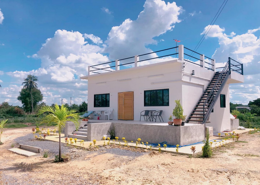 บ้านโมเดิร์น-มินิมอลหลังนี้ประกอบไปด้วย 2 ห้องนอน 2 ห้องน้ำ 1 ห้องครัว 1 ห้องโถงนั่งเล่น มีเฉลียงพักผ่อนหน้าบ้าน รวมถึงมีดาดฟ้าเปิดโล่งเพื่อกิจกรรมกลางแจ้ง พื้นที่ใช้สอยทั้งหมดประมาณ 72 ตารางเมตร งบก่อสร้างอยู่ที่ประมาณ 1.4 ล้านบาท