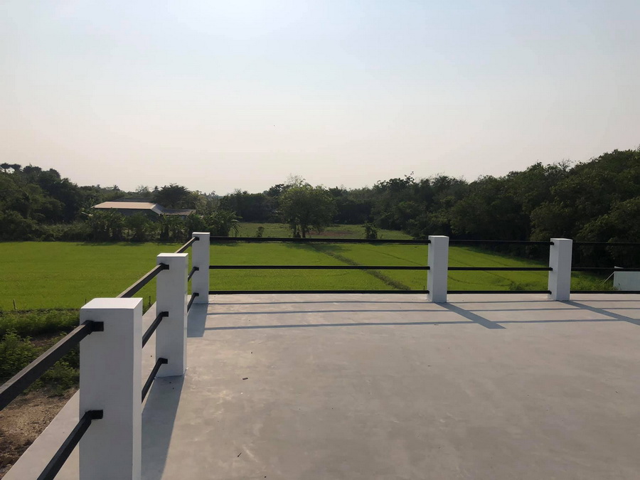 จุดเด่นของบ้านหลังนี้ที่ออกแบบให้มีดาดฟ้าเปิดโล่งที่เหมาะกับการใช้เป้นพื้นที่กิจกรรมกลางแจ้งอย่างเช่นการปาร์ตี้สังสรรค์ โดยจะมีวิวเป็นทุ่งนาเขียวขจี