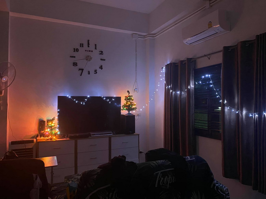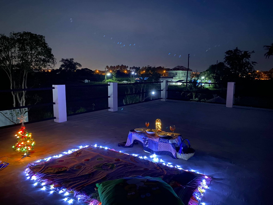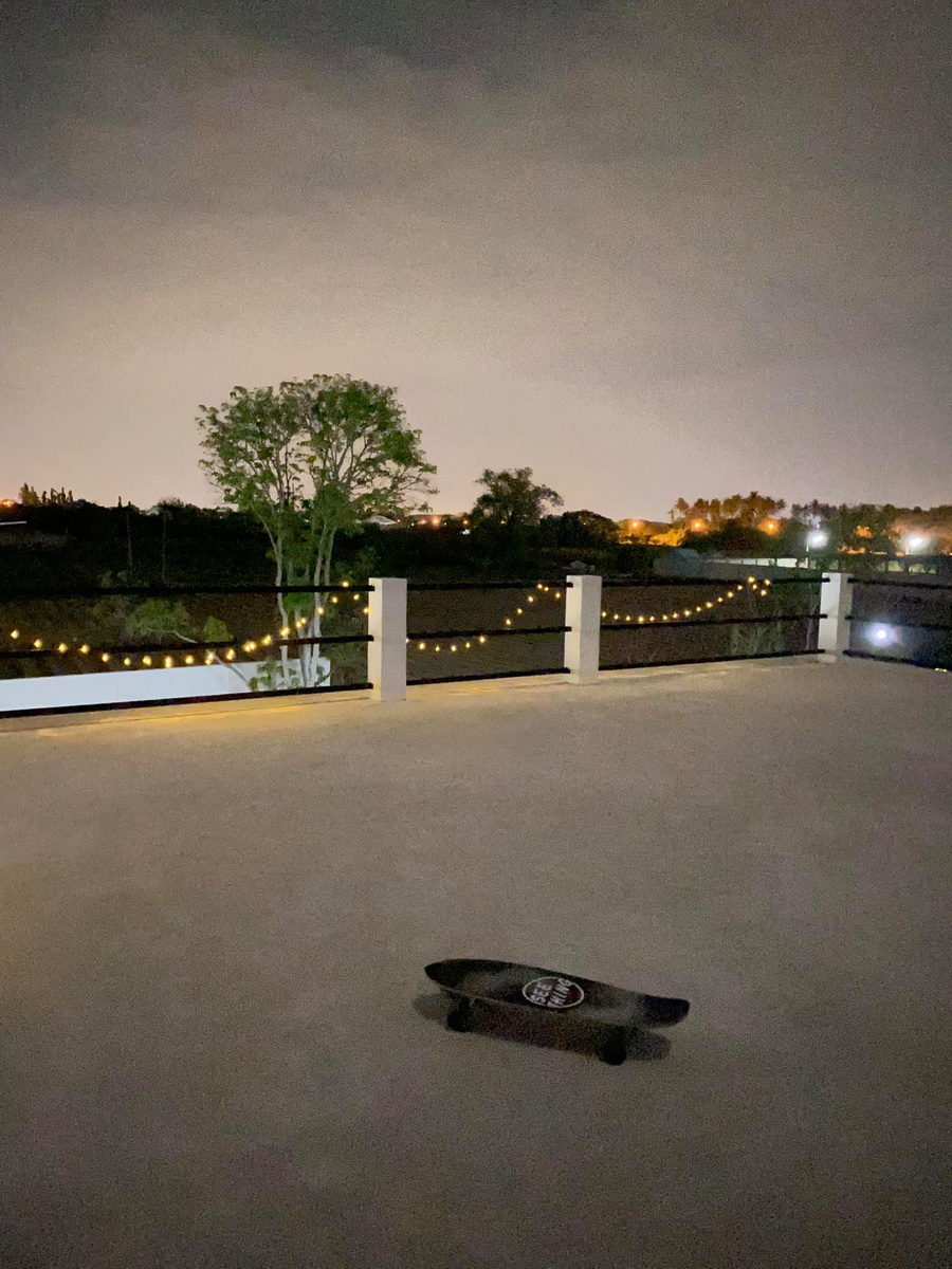 ในยามค่ำคืน ก็เป็นช่วงเวลาที่เหมาะกับการมาใช้พื้นที่ดาดฟ้า ซึ่งเจ้าของบ้านได้มีการตกแต่งด้วยไฟสายที่ให้แสงสวยงาม ให้บรรยากาศที่สุดพิเศษ
