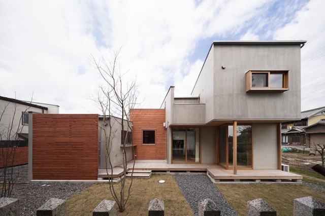 ภายนอกนั้นออกแบบให้มีสนามหญ้า บนเนินหญ้าเตี้ยๆ ถึงว่าเป็นลานรองรับกิจกรรมได้เล็กๆ น้อยๆ ตกแต่งรอบๆ บ้านด้วยไม้ยืนต้น สร้างบรรยากาศที่ร่มรื่น เน้นย้ำให้ตัวบ้านนั้นน่าอยู่มากขึ้น