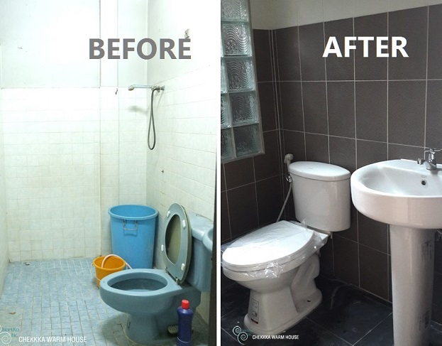เริ่มที่สภาพก่อนรีโนเวท ยาแนวพื้นและผนังเก่า มีคราบของการใช้งานมานาน มีการแยกส่วนเปียก ส่วนแห้งไว้อยู่แล้ว แต่อาจจะไม่ได้ชัดเจนนัก ส่วนอาบน้ำใช้เป็นถังน้ำเพื่อรองไว้อาบ