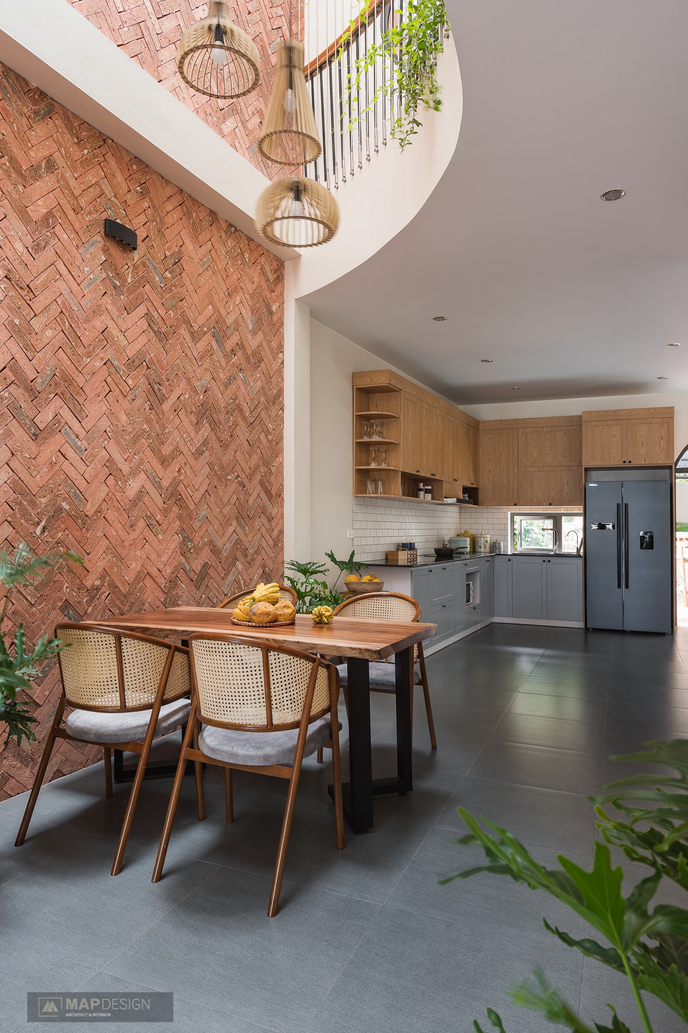 อิฐดินเผา คือองค์ประกอบสำคัญที่ถูกนำมาใช้เป็นอัตลักษณ์ของบ้านหลังนี้ ด้วยเนื้อวัสดุและโทนสีของก้อนอิฐ จะให้บรรยากาศบ้านที่ดูสวยงามคลาสสิกได้ไม่น้อยเลย