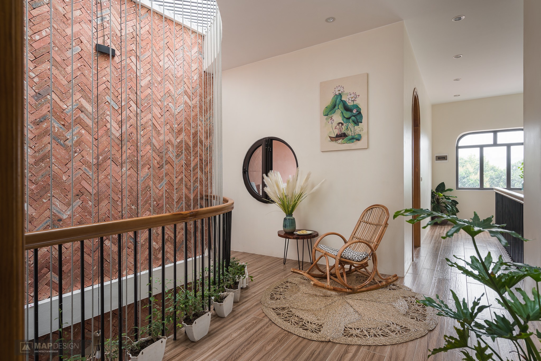 บรรยากาศของการตกแต่งภายในบ้าน เรายังจะพบกับผนังอิฐในส่วนกลางของบ้าน ในขณะที่ส่วนอื่น ๆ จะเน้นการใช้เฟอร์นิเจอร์ไม้ และประดับด้วยต้นไม้เล็ก ๆ เพื่อให้บ้านมีบรรยากาศแบบเป็นธรรมชาติ