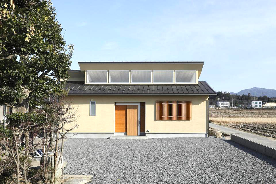 สวนแบบญี่ปุ่นด้านหน้าบ้าน ทำให้รู้สึกสงบและรู้สึกสบายตั้งแต่แรกเห็น ขณะที่บ้านชั้นเดียวมีหลังคาที่ค่อนข้างสูง สังเกตว่าจะเห็นหน้าต่างกระจกไว้รับแสงให้ส่องไปด้านในบ้าน