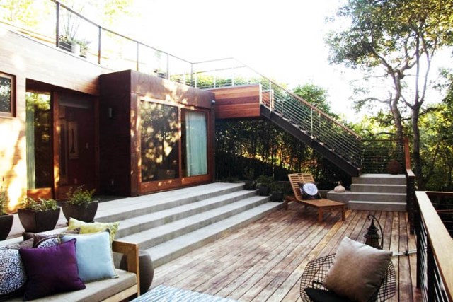 ตัวบ้านทรงกล่องสี่เหลี่ยม แบบสมัยใหม่ ยกพื้นให้เป็นเฉลียงพองาม ตกแต่งด้วยไม้สีสวยทั้งหลัง และกระจก ก็นับว่าเป็นวัสดุที่เข้ากันได้ดีเยี่ยม มากับดาดฟ้าสวยงาม สร้างด้วยไม้บนโครงสร้างเหล็กแข็งแรง ไว้เทควิว และได้ฟังก์ชันเพิ่มเติม