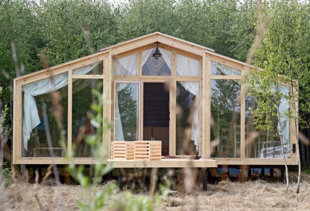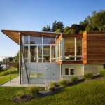 บ้านโครงสร้างไม้ ออกแบบรูปทรงเรียบง่าย แต่ก็ดูแปลกตา ใช้กระจกเป็นตัวไฮไลท์ของการตกแต่ง คู่กับไม้สีอ่อน ทั้งหลัง หลังคาจั่วชิ้นใหญ่ คลุมทั้งบ้าน