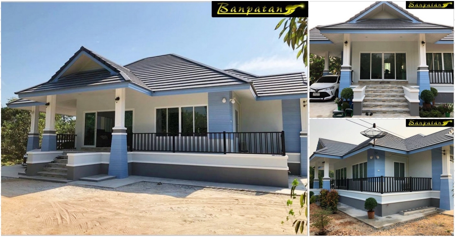 บ้านชั้นเดียวไทยประยุกต์ ตกแต่งในโทนฟ้า-ขาว สบายตา 2 ห้องนอน 2 ห้องน้ำ งบเริ่มต้น 1.2 ล้านบาท