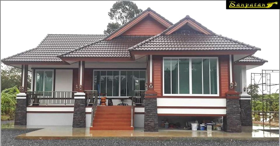 สำหรับบ้านหลังนี้เป็นบ้านชั้นเดียวออกแบบยกพื้นขึ้นสูง ตัวบ้านเป็นบ้านทรงไทยที่ผสานการออกแบบและวัสดุที่ทันสมัย หลังคาของบ้านเป็นหลังคาทรงมะนิลาที่มุงด้วยกระเบื้องลอนสีน้ำตาลเข้ม ผนังภายนอกเลือกใช้โทนสีขาว และน้ำตาลที่เข้ากันได้อย่างลงตัว
