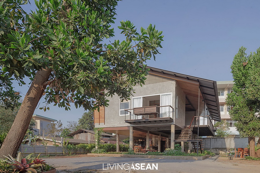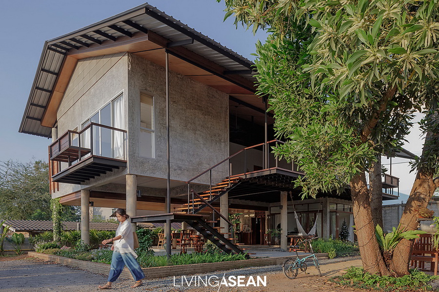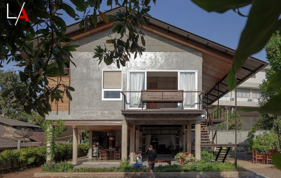 บ้านขนาดสองชั้นที่ออกแบบใต้ถุนยกสูง จึงมีพื้นที่ใช้สอยที่หลากหลายทั้งจากภายในบ้านและในส่วนของใต้นถุนเปิดโล่ง การออกแบบได้รับอิทธิพลมาจากบ้านแบบไทยเดิมที่เหมาะกับสภาพอากาศ ผสานกับการตกแต่งแบบสมัยใหม่ แต่ยังคงเน้นบรรยากาศที่ดูเรียบง่ายเป็นกันเอง