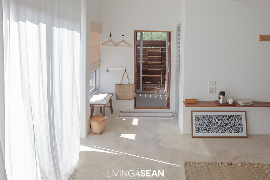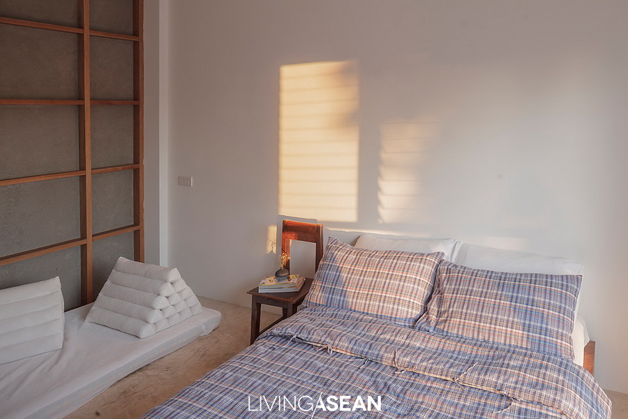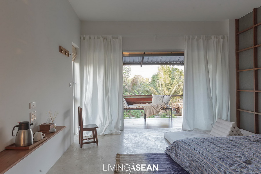 ภายในห้องนอนถูกตกแต่งอย่างเรียบง่าย ให้บรรยากาศแบบมินิมอลผสมกับไทยเดิม ตัวห้องนอนเชื่อมต่อไปยังเฉลียงด้านนอกที่ให้บรรยากาศที่สดชื่นได้ตลอดวัน