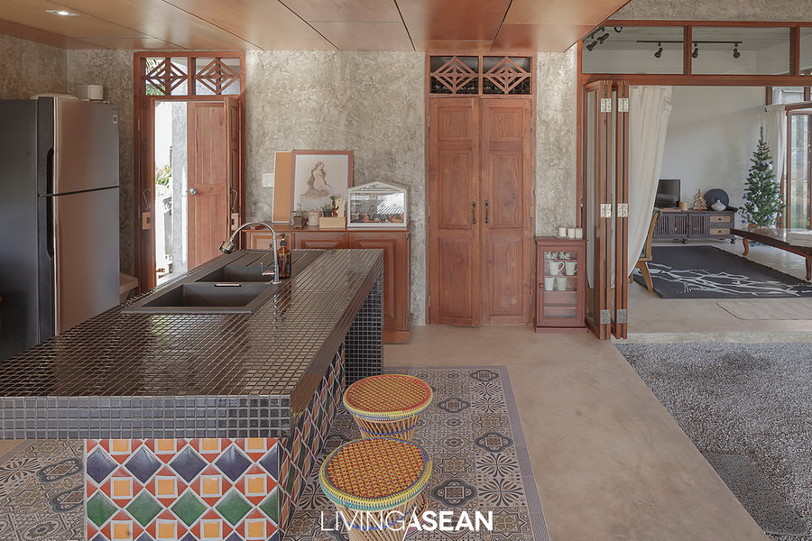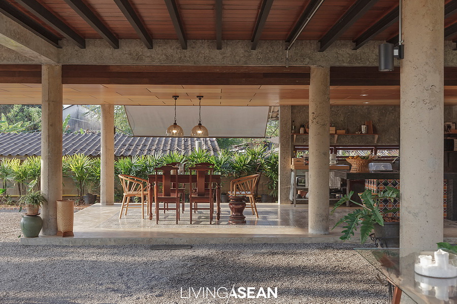 พื้นที่ครัวที่ตั้งอยู่บริเวณใต้ถุนบ้าน ถูกตกแต่งอย่างสวยงามในบรรยากาศที่เปิดโล่ง จึงเหมาะกับการทำอาหารไทยที่มีกลิ่นและควันมาก