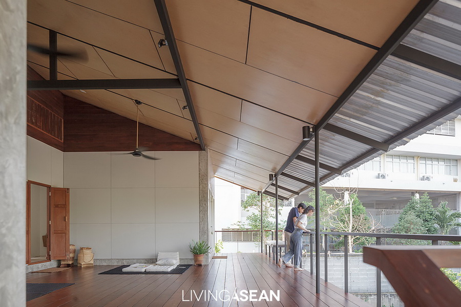 ในส่วนของชั้นบน พื้นที่บริเวณนี้จะเป็นชานบ้านที่โปร่งโล่งและกว้าง เป็นพื้นที่ใช้สอยเอนกประสงค์ตามแบบฉบับของบ้านไทย เหมาะกับวิถีชีวิตและสภาพอากาศของเมืองไทย