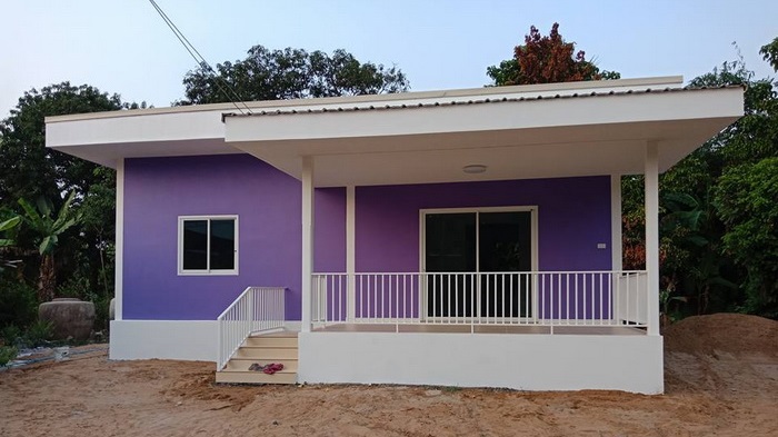 ลักษณะบ้านเดี่ยวชั้นเดียวขนาดเล็ก ออกแบบด้วยรูปทรงที่เรียบง่าย ภายนอกตกแต่งด้วยโทนสีม่วงบริเวณตัวผนัง และตกแต่งด้วยโทนสีขาวในส่วนอื่นๆ ของบ้าน ด้วยการออกแบบตัวบ้านขนาดเล็ก จึงเหมาะสำหรับครอบครัวเดี่ยวขนาดเล็ก