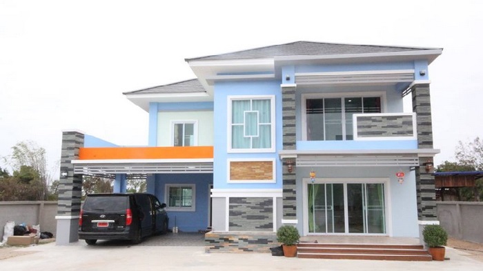2BR16003-2 ลักษณะบ้าน 2 ชั้น หลังคารูปทรงปั้นหยา มุงด้วยกระเบื้องโทนสีเทา ภายนอกตกแต่งด้วยโทนสีที่หลากหลาย แต่เน้นที่โทนสีฟ้าเป็นหลัก ให้ความรู้สึกอ่อนโยนสบายตา แซมด้วยสีส้มและสีเทา ตัวบ้านมาพร้อมกับพื้นที่จอดรถ และระเบียงเปิดโล่งกว้างบริเวณชั้นบน