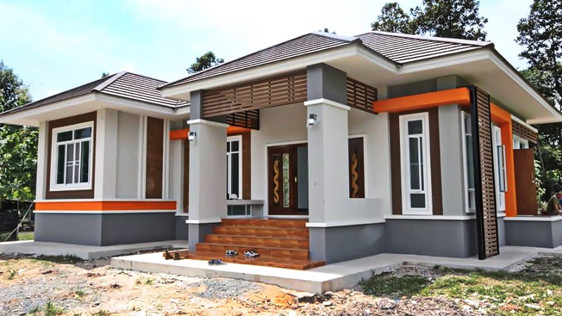 ตัวบ้านชั้นเดียว หลังคาทรงปั้นหยา ผนังภายนอกคุมด้วยโทนสีเทา สอดแทรกไปด้วยรายละเอียดการตกแต่งต่างๆ ที่ช่วยเสริมความสวยงาม ไม่ว่าจะเป็นแถบคอนกรีตสีส้ม ระแนงไม้บริเวณใต้หลังคาเฉลียง และระแนงไม้ด้านข้างตัวบ้าน