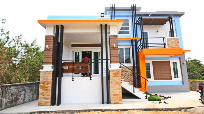 ลักษณะบ้านขนาดสองชั้น ออกแบบด้วยสไตล์โมเดิร์น ตัวบ้านยกพื้นต่ำ ผนังภายนอกตกแต่งในโทนสีที่สดใส ได้แก่สีฟ้า สีเทา และสีส้ม ให้บรรยากาศที่สดใส หลังคาของบ้านออกแบบด้วยหลังคารูปทรงแบน ให้ความผสานลงตัวไปกับรูปทรงของบ้านได้เป็นอย่างดี