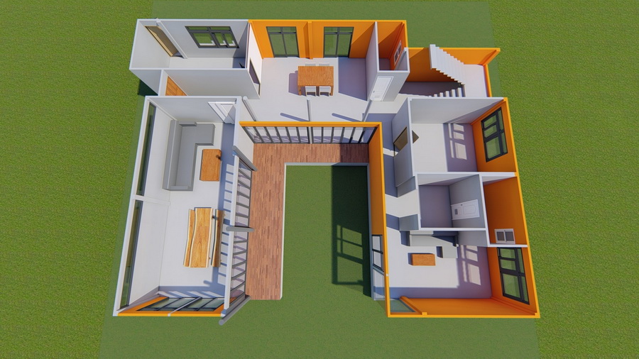 แบบบ้านสองชั้นสไตล์โมเดิร์นรูปทรงตัวยู (U-Shape House) หลังนี้ประกอบไปด้วย 3 ห้องนอน 3 ห้องน้ำ 1 ห้องครัว 1 ห้องรับแขก พื้นที่ใช้สอยรวม 225 ตารางเมตร งบประมาณก่อสร้างอยู่ที่ 2.49 ล้านบาท ต้องการเฉพาะแบบแปลนพร้อมวิศวกรรับรอง คิดค่าใช้จ่าย 29,500 บาท ( พร้อม BOQ ) สามารถนำไปยื่นขออนุญาตก่อสร้างได้ทันที
