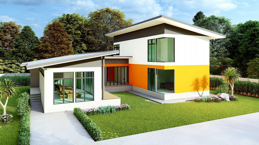 บ้านขนาดสองชั้น ออกแบบในสไตล์โมเดิร์น มีการจัดวางตัวบ้านแบบตัวยู ทำให้มีพื้นที่โล่งกว้างอยู่ตรงกลางอย่างโดดเด่น ด้านการตกแต่งนั้น หลังคาของบ้านเป็นหลังคาทรงเพิงหมาแหงน ผนังภายนอกเลือกใช้โทนสีขาวครีมเป็นหลัก แซมด้วยสีเหลืองและสีส้ม