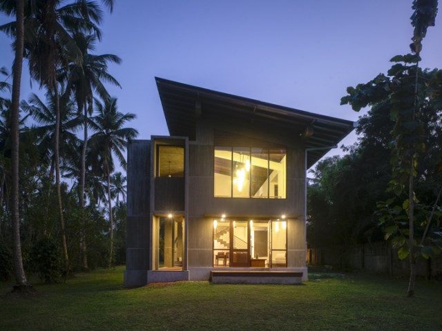 บ้านโครงสร้างคอนกรีต และเหล็ก โดดเด่นเพราะใช้ปูนเปลือย สลับไปกับกระจกบานใหญ่สะท้อนงานตกแต่งแบบสมัยใหม่ ให้อารมณ์ดิบๆ อาร์ตๆ หลังคาทรงเพิงหมาแหงนลาดเอียงเก๋ๆ รับด้วยโครงเหล็ก และมุงด้วยเมทัลชีท น้ำหนักจึงเบา และดูโปร่งโล่งมากขึ้น