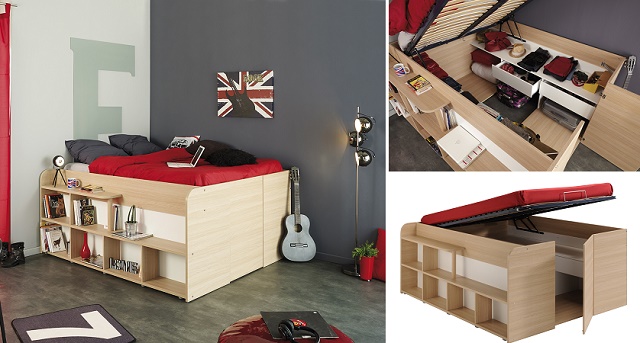 ฟังก์ชั่นหลักคือเตียง ที่สามารถยกขึ้น ซ่อนตู้เสื้อผ้าขนาดเล็กไว้ด้านล้าง ดูเก๋ไก๋มากเลยทีเดียว