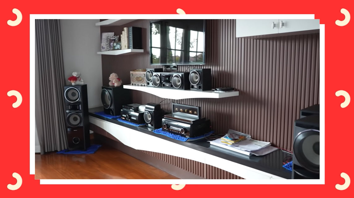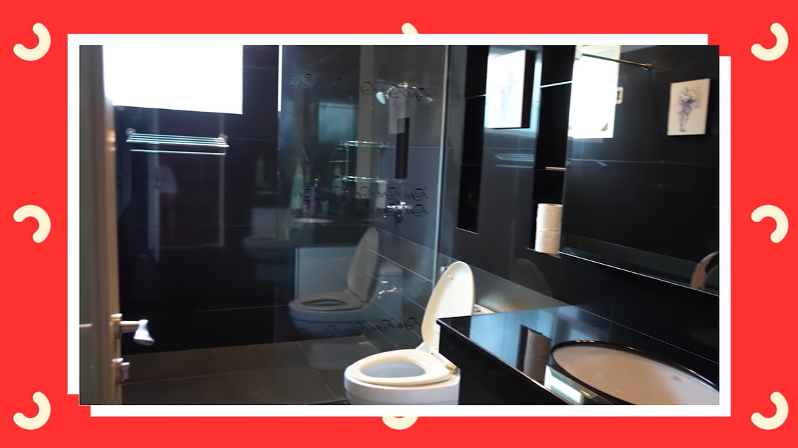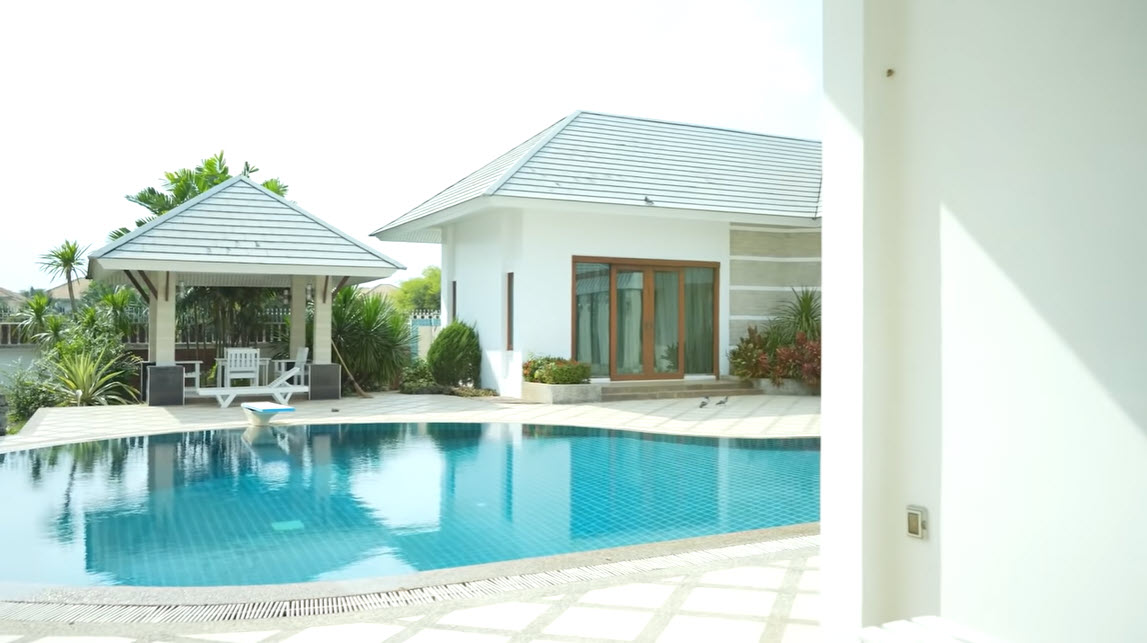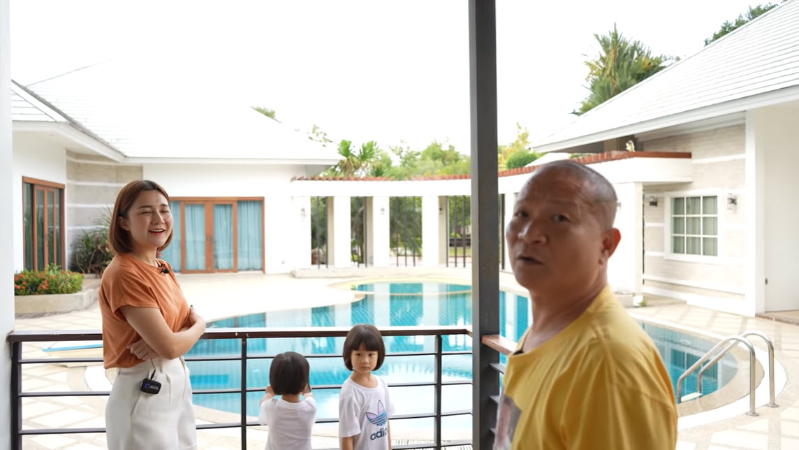 ส่วนอีกฝั่งของสระว่ายน้ำเดิมเป็นเรือนรับรอง ตอนนี้เป็นโดมของลูกชาย เป็นห้องอัดของเขา สระว่ายน้ำรูปแผนที่ประเทศไทย เพราะพ่อเป็นคนไทยเลยทำสระว่ายน้ำรูปประเทศไทย