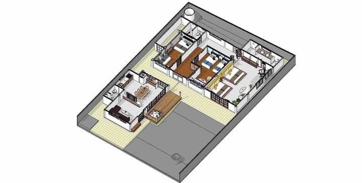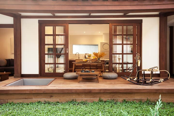โดยที่ตัวบ้านจะเป็นอาคารสองหลัง จัดวางในรูปทรงแบบตัวแอล มีเฉลียงกว้างแบบญี่ปุ่น ด้านการตกแต่งนั้น ตัวอาคารจะเลือกใช้สองโทนสีคู่กัน คือ สีขาวครีมกับสีน้ำตาล จึงให้บรรยากาศที่อบอุ่นสวยงาม