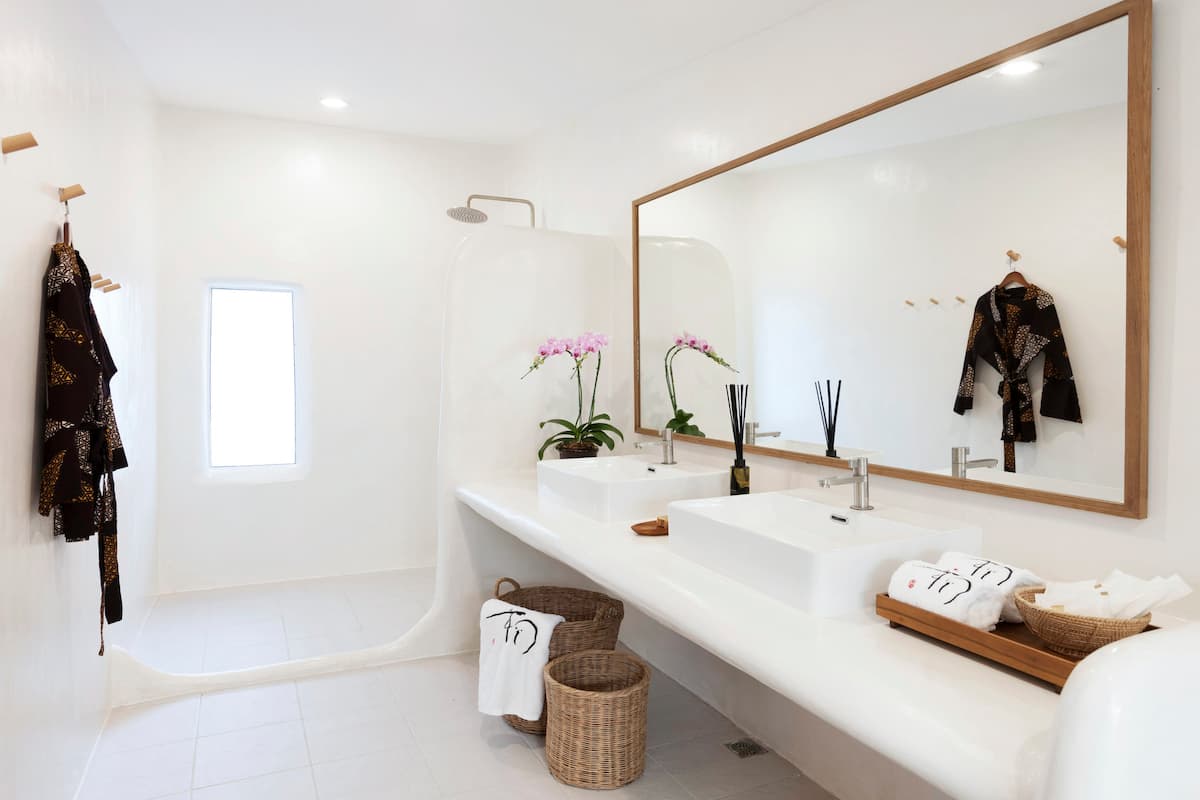 เช่นเดียวกันกับห้องน้ำ ที่จะเน้นพื้นที่ใช้สอยแบบกว้าง ๆ นอกจากนี้ ภายในห้องน้ำยังตกแต่งในโทนสีขาวสว่าง จึงช่วยสร้างบรรยากาศที่ผ่อนคลายในการใช้งานอีกด้วย
