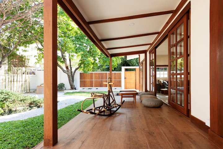 จากภายนอกบ้านเรายังเห็นถึงรายละเอียดของลักษณะถนนและซอยที่ยังเป็นแบบไทย ๆ อยู่ แต่เมื่อมองเข้าไปยังภายในตัวบ้าน เราก็จะเห็นถึงบรรยากาศของบ้านและการตกแต่งภูมิทัศน์โดยรอบที่แตกต่างออกไปอย่างสิ้นเชิง ให้ลักษณะที่ดูเชื้อเชิญให้เข้าไปสัมผัสกับความงามของบ้าน