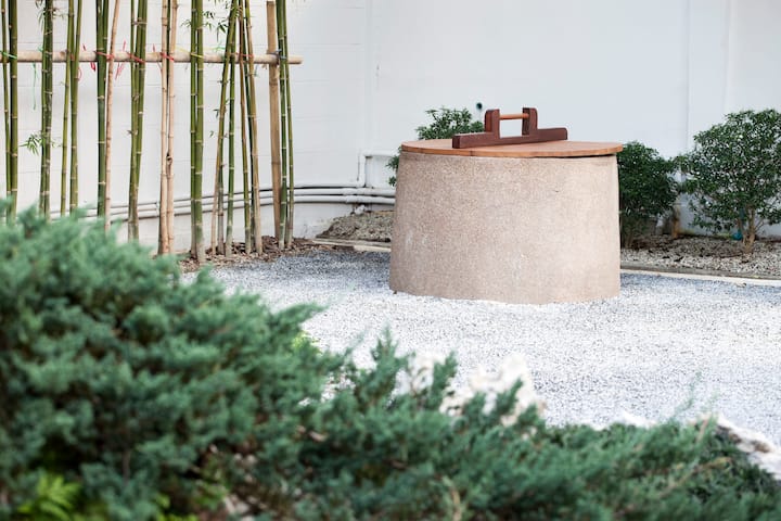 การตกแต่งและจัดองค์ประกอบในมุมนี้ นักออกแบบค่อนข้างใส่ใจในรายละเอียด ยังมีบ่อน้ำที่มีฝาปิดแบบญี่ปุ่น มีฉากหลังเป็นแนวต้นไผ่ ในขณะที่พื้นถูกโรยด้วยกรวด