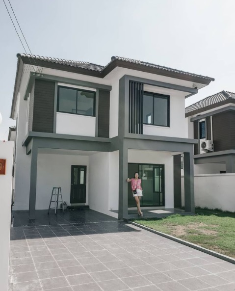 สำหรับบ้านหลังใหม่ของน้าค่อม เป็นบ้านที่อาศัยอยู่กับลูกสาวและหลานสาว โดยตัวบ้านเป็นบ้านสไตล์คอนเทมโพรารีในโครงการบ้าน ด้านงานออกแบบนั้น เป็นบ้านสองชั้นที่มีรูปทรงในแบบที่เราคุ้นตากันดี ภายนอกตกแต่งด้วยโทนสีขาวครีม ตัดด้วยขอบสีเทาและดำอย่างเรียบง่าย