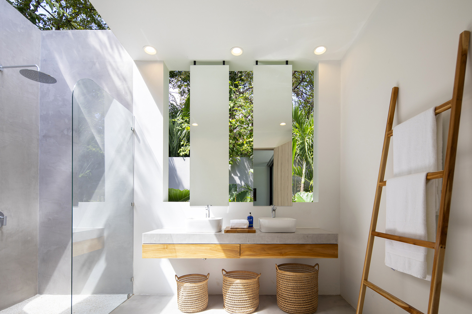 หรือแม้แต่ในส่วนของห้องน้ำเอง ก็เป็นอีกห้องที่ออกแบบให้มีพื้นที่เปิดโล่ง เชื่อมต่อกับธรรมชาติ จึงทำให้การอาบน้ำเป็นไปอย่างผ่อนคลาย