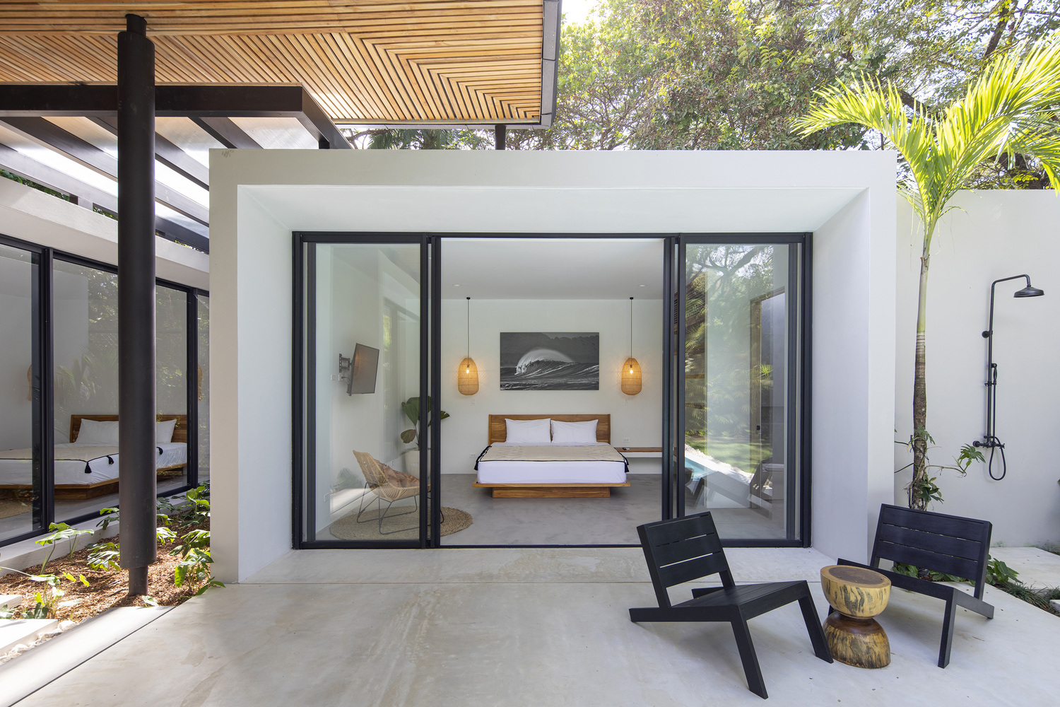 แม้แต่ห้องนอนเอง ก็ยังออกแบบเน้นความโปร่งโล่ง จากการออกแบบประตูบานเลื่อนที่เป้นกระจกใสบานใหญ่ ซึ่งตัวห้องนอนเองก็ตั้งอยู่ติดกับสระว่ายน้ำอีกด้วย