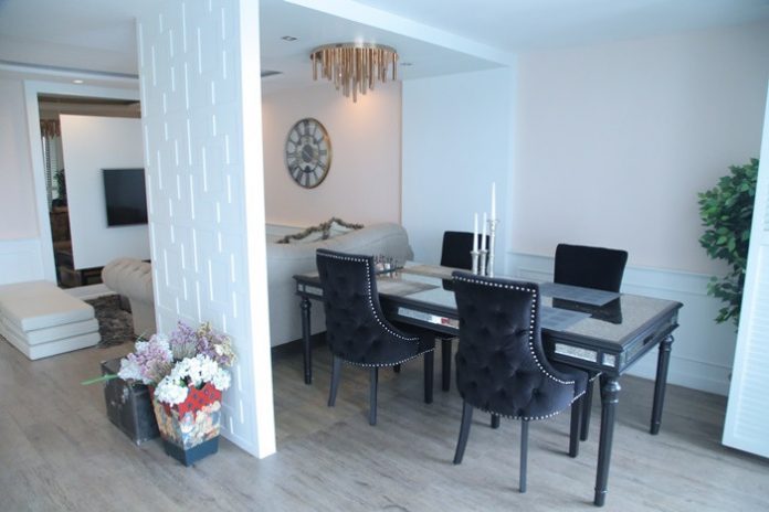 ถัดออกมาจากพื้นที่ห้องนั่งเล่นจะเป็นพื้นที่ขอโต๊ะรับประทานอาหาร ซึ่งก็ยังคงเน้นการตกแต่งดีไซน์ในแบบหรูหรา สะท้อนการชุดเก้าอี้หนังและเชิงเทียนแบบคลาสสิก