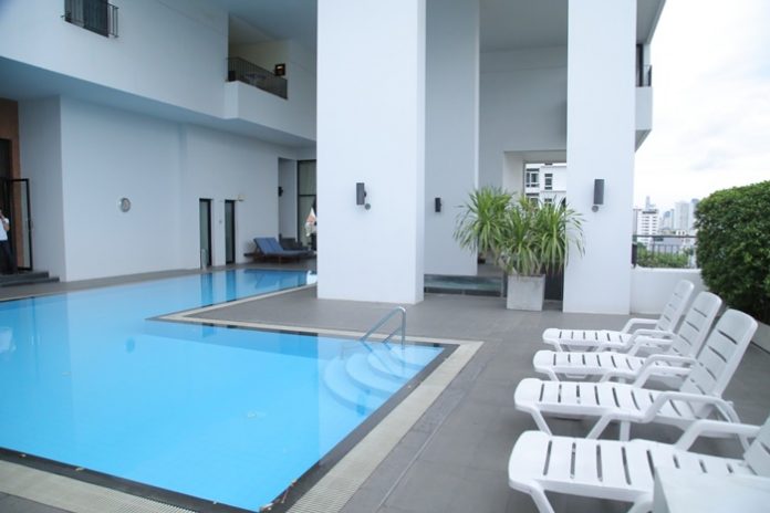 บริเวณนี้จะเป็นพื้นที่ของสระว่ายน้ำในโครงการ ซึ่งเป็นสระว่ายน้ำรูปตัวแอล ริมสระก็มีพื้นที่ให้นั่งพักผ่อนหย่อนใจไว้หายมุม สามารถเลือกพักผ่อนได้ตามต้องการเลย