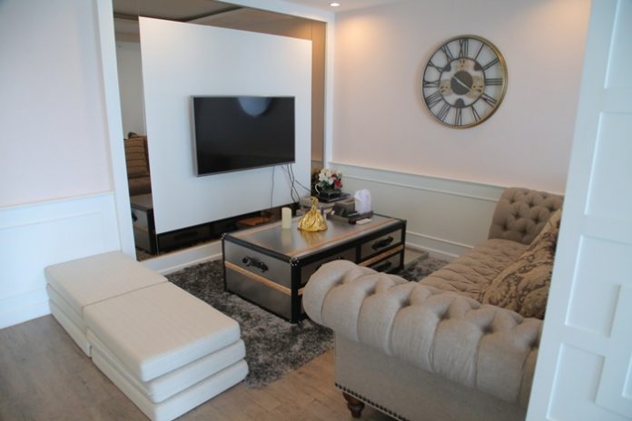 ส่วนของพื้นที่ห้องนั่งเล่นมุมนี้ เป็นมุมเล็ก ๆ ที่มีสิ่งอำนวยความสะดวกและสื่อความบันเทิงที่ครบครัน ด้านรายละเอียดการตกแต่งจะเน้นท่ความหรูหราคลาสสิก ทั้งจากชุดโซฟาและนาฬิกาติดผนังตัวใหญ่