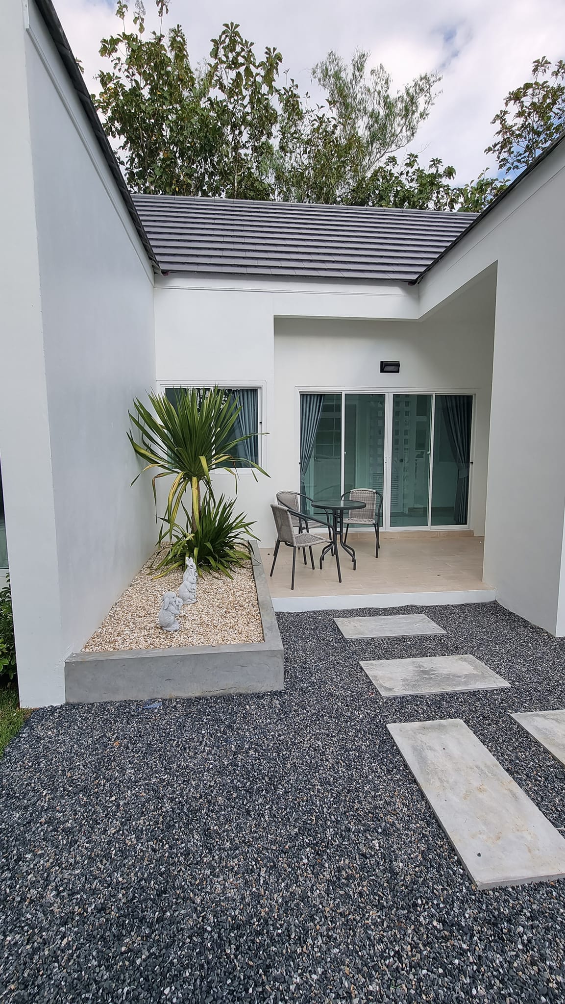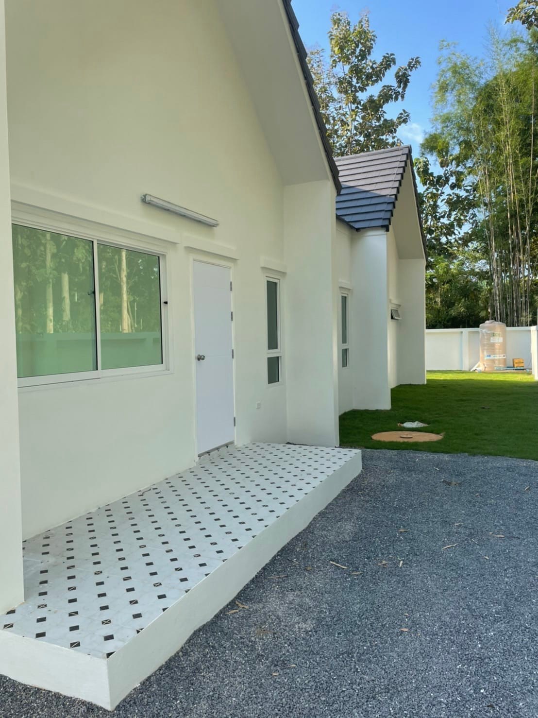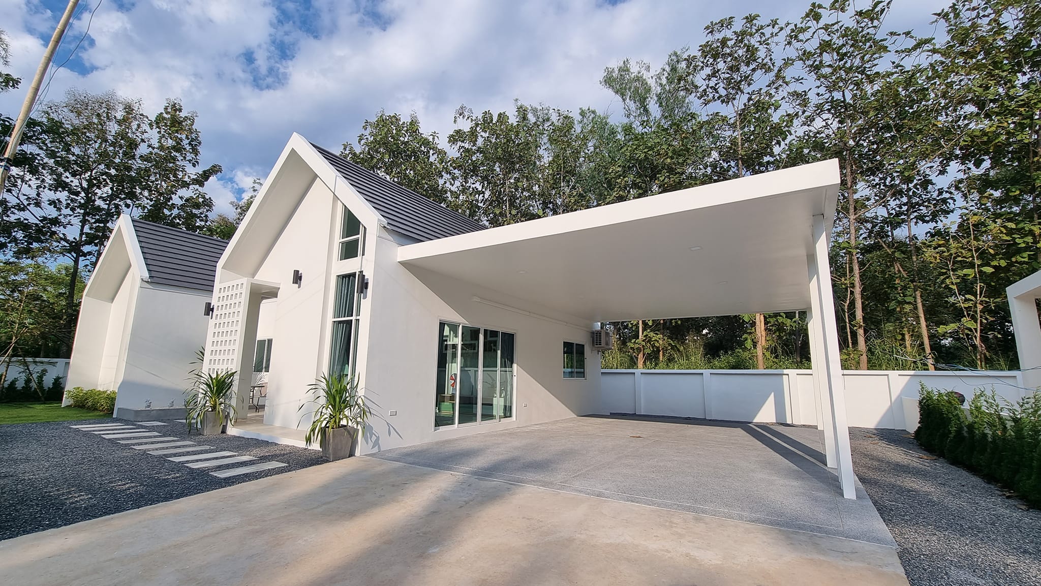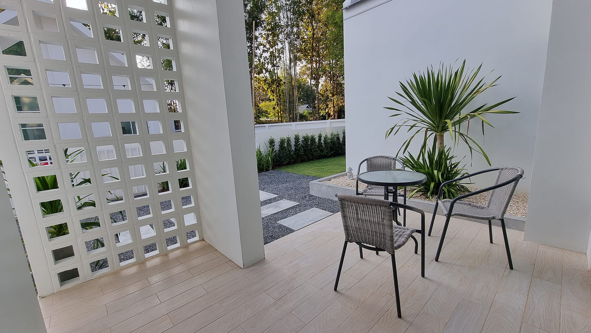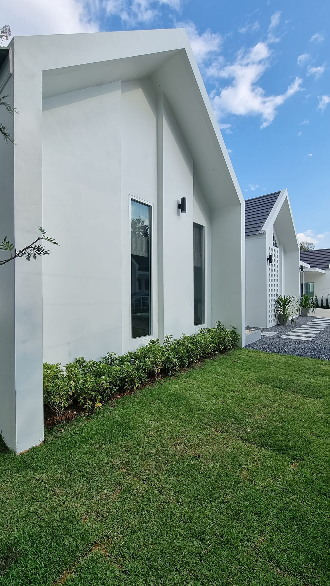 ภายนอกตกแต่งด้วยโทนสีขาวทั้งหลัง จึงให้บรรยากาศที่ดูผ่อนคลาย นอกจากนี้ยังมีหน้าต่างกระจกใสหลายมุม ทำให้ภายในบ้านมีความโปร่งสบาย
