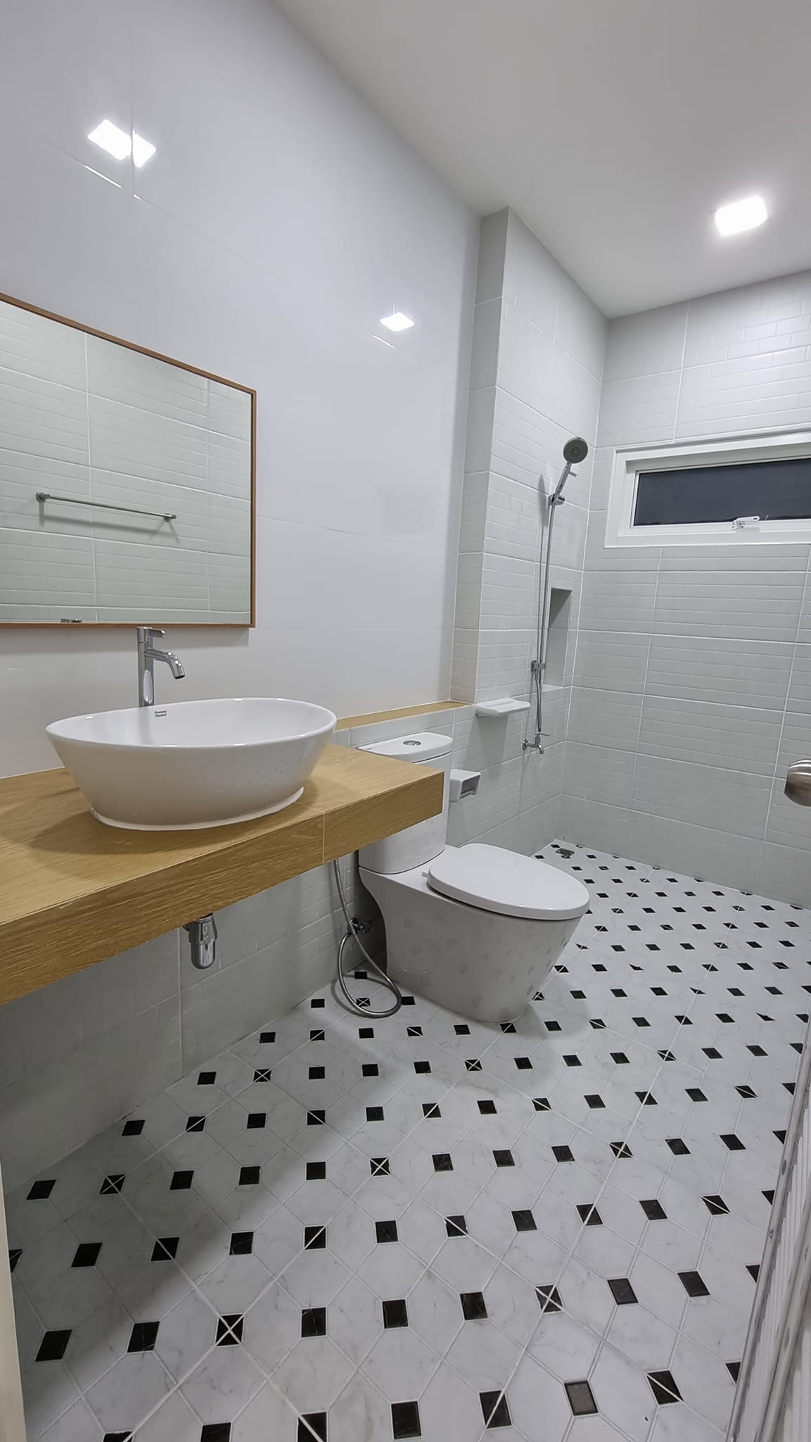 ส่วนห้องน้ำ จะเป็นส่วนที่ตกแต่งให้มีลวดลายเพิ่มขึ้นมาอีกนิดผ่านการปูด้วยกระเบื้องโทนขาวดำ ภายในห้องน้ำก็จะมีองค์ประกอบที่ครบทุกฟังก์ชัน สะดวกทุกการใช้งาน