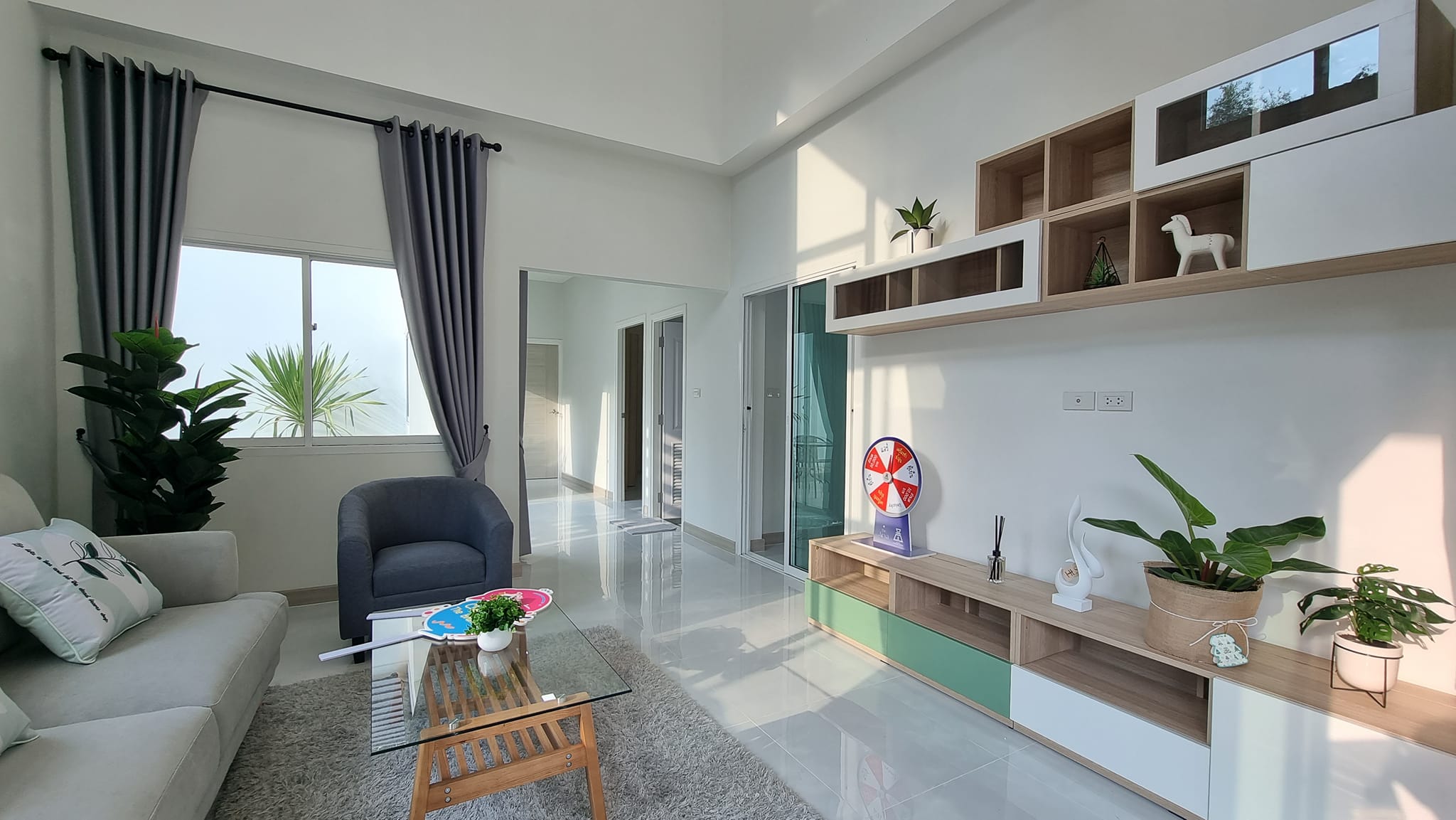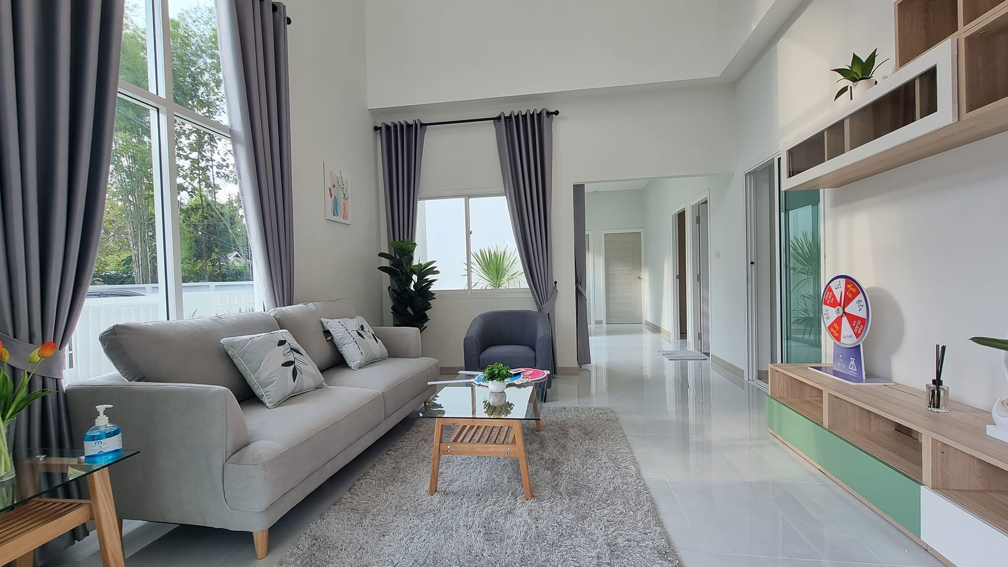 การตกแต่งภายในห้องนั่งเล่น จะใช้เฟอร์นิเจอร์โทนสีอ่อนแบบเอิร์ธโทน เพื่อให้เข้ากับผนังสีขาวของห้อง นอกจากนี้ยังตกแต่งด้วยต้นไม้เล็ก ๆ เพื่อเพิ่มสีเขียวให้ห้องอีกด้วย