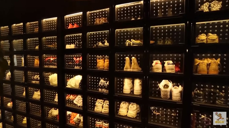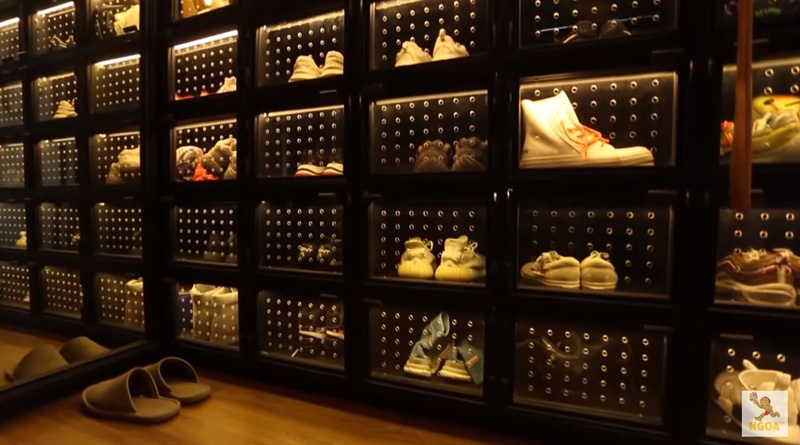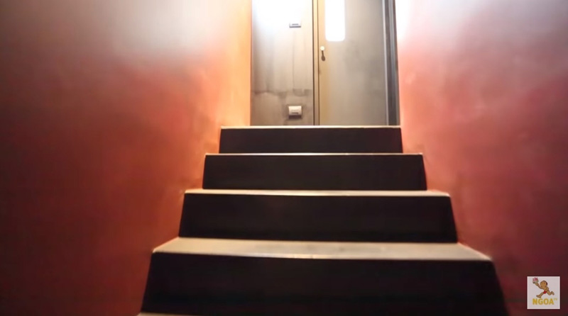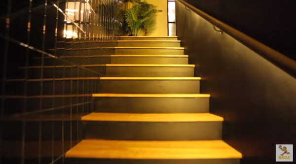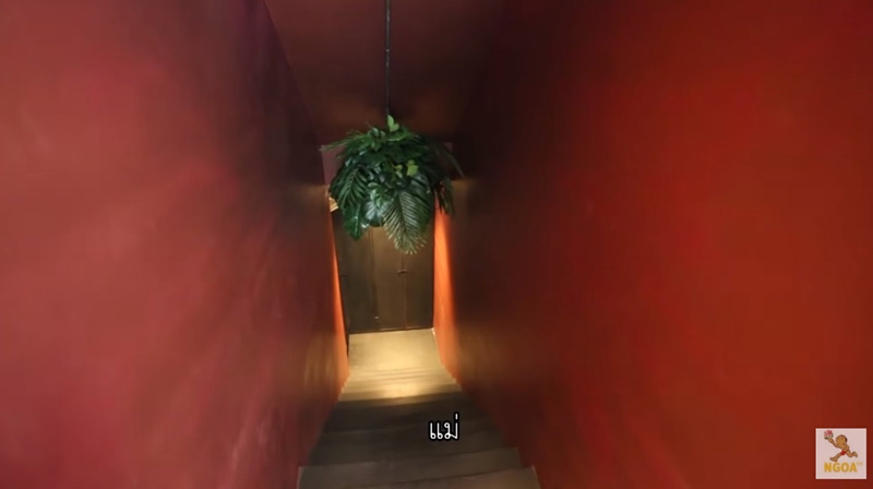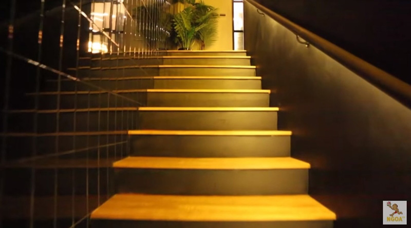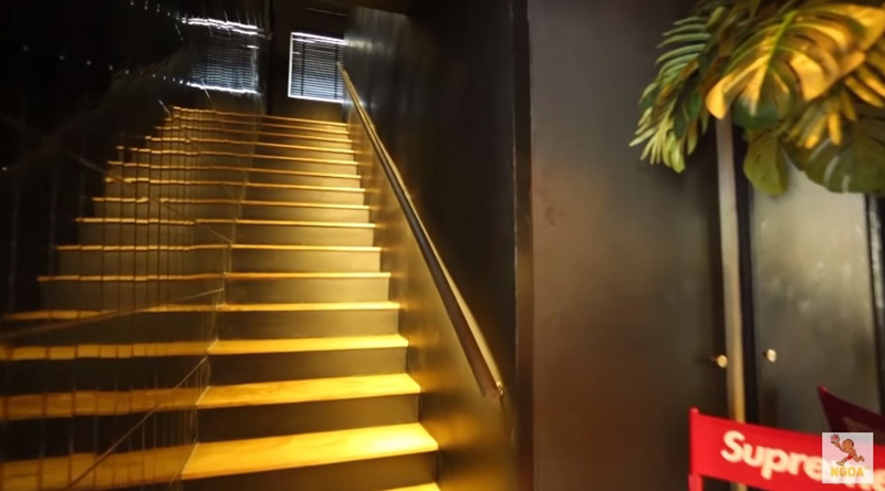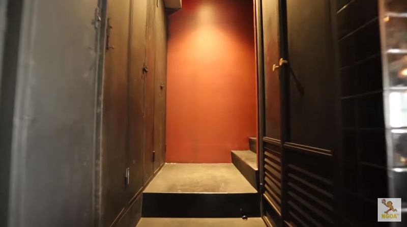ส่วนอีกผั่งหนึ่งจะเป็นโซนบ้านพักอาศัย มีตู้รองเท้าขนาดใหญ่ แบ่งช่องเก็บอย่างเป็นระเบียบ ฝั่งตรงข้ามมีบันไดดีไซน์สุดเท่อยู่ด้วย ซึ่งบริเวณนี้เน้นตกแต่งในโทนสีดำและมีไฟนีออนติดตั้งไว้อยู่