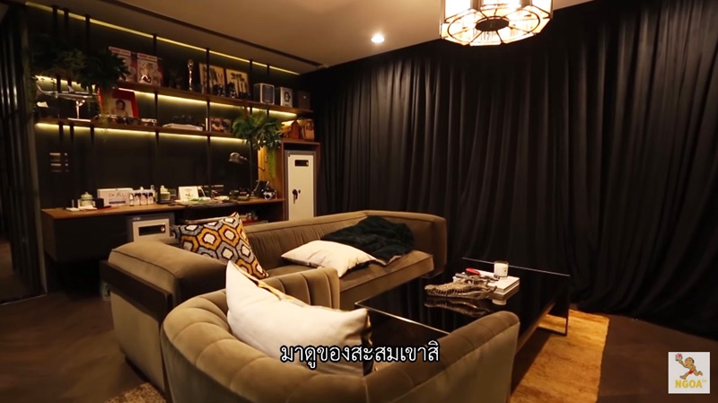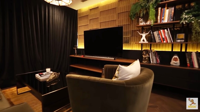 ถัดไปคือห้องนั่งเล่นขนาดกำลังดี ตกแต่งแบบผู้ชายแมน ๆ ในโทนสีเข้มขรึมเน้นโทนสีดำ เหลือง เขียว และทองเหลือง