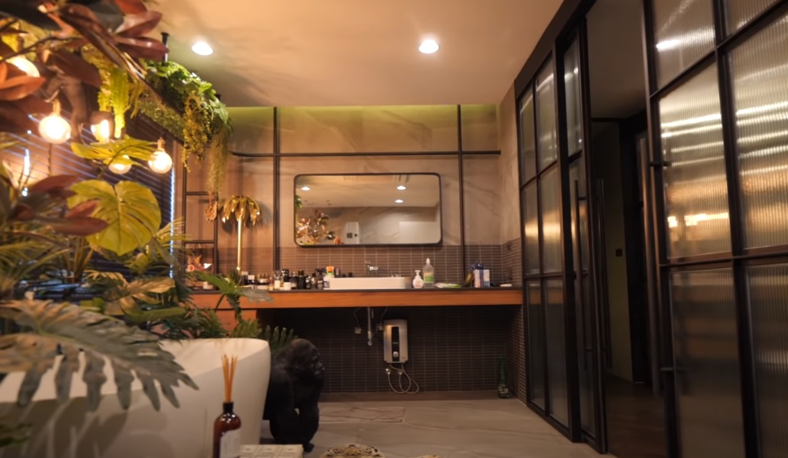 เนื่องจากบริเวณส่วนอื่น ๆ ของบ้านเป็นสไตล์อินดัสเทรียลแบบดิบ ๆ ทำให้คุณโอ๊ตเลยตกแต่งห้องน้ำให้มีบรรยากาศสีเขียวที่ให้ความสดชื่นผ่อนคลายได้บ้าง