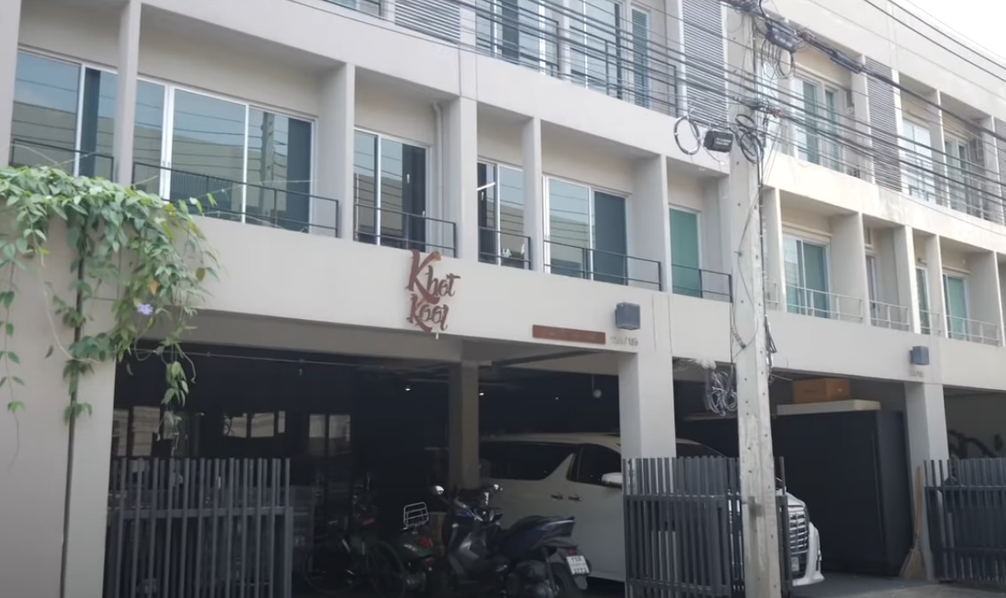หากมองจากภายนอก เราจะเห็นตัวอาคารของบ้านมีลักษณะเป็นแบบบ้านทาวน์เฮ้าส์ทั่ว ๆ ไป เป็นอาคาร 3 ชั้นที่ชั้นล่างสุดจะมีที่จอดรถกว้างขวางเลย เพราะนอกจากจะเป็นบ้านพักแล้ว หนุ่มโอ๊ตยังใช้บ้านหลังนี้เป็นออฟฟิศที่มีพนักงานมาทำงานอีกหลายชีวิตด้วย
