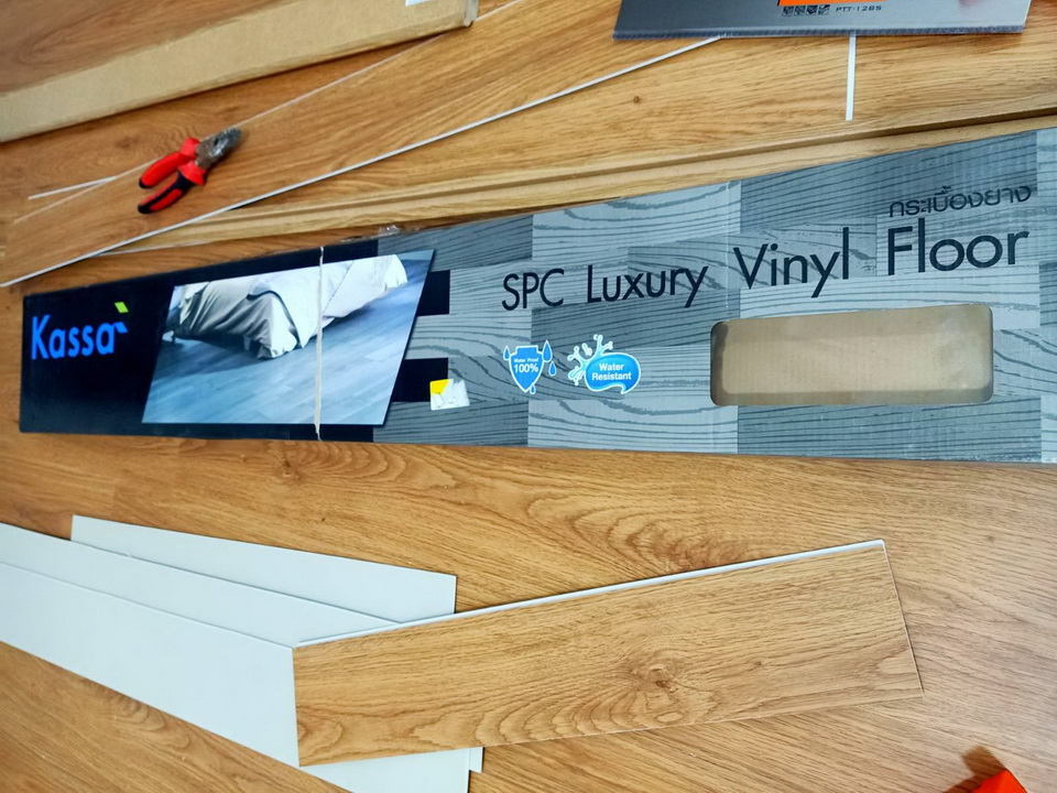 เราบอกว่าอยากได้บ้านไม้อบอุ่น คุณแฟนจัดไปปูพื้นไวนิลสีไม้แบบคลิกล็อคค่ะ ช่วยกันติดตั้ง ห้องนี้สองวันก็เป็นอันเสร็จค่ะ