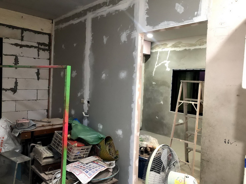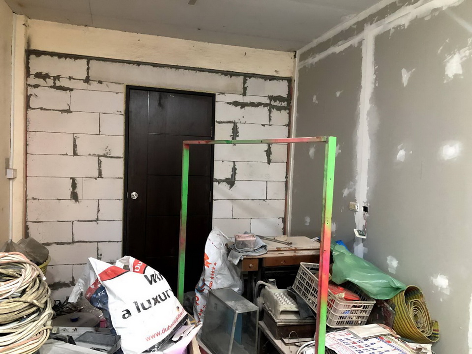 แฟนจึงจัดการเปลี่ยนเป็นผนังเบาและมีช่องประตูเป็นบานเลื่อนเพื่อประหยัดพื้นที่ขึ้น โดยสร้างโครงคร่าวขึ้นมาก่อนอาศัยเพิ่มเสริมเหล็กในโครงขึ้นมาเพื่อรับน้ำหนักประตูได้ดีขึ้น