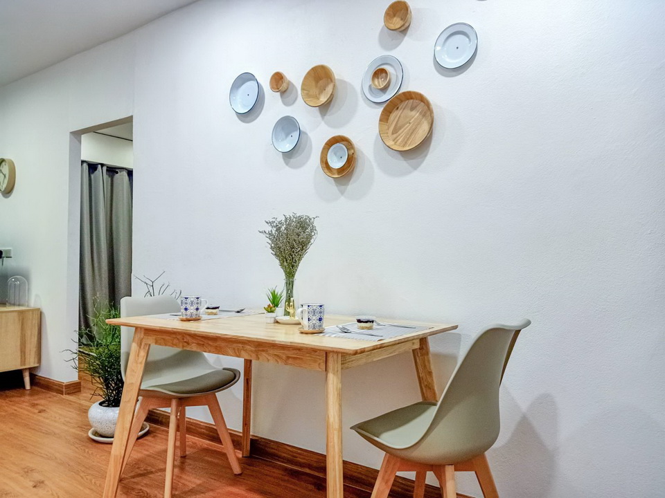 อยากได้แนวคาเฟ่หน่อยๆ ได้ไอเดียผนังไปเจอที่อิเกียมา ติดจานไม้และชามสังกะสีได้จากJJ mallค่ะ