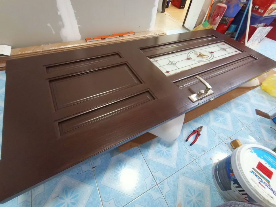 ส่วนบานเก่านำไปติดหลังบ้านแทน ซึ่งบานเดิมหลังบ้านเป็นประตูไม้อัดผุแล้ว